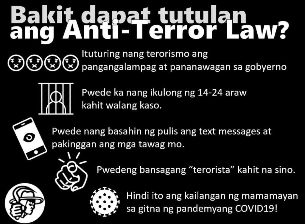 “We are in a pandemic. The people are seeking for urgent economic aid and relief, health and social services, mass testing and mass transportation. There are much more urgent and important legislation that Congress can prioritize and focus on. Why fast track the Anti-Terror Bill at this time when the population is exasperated with the government’s incompetence and neglect?,” the KMP leader said.