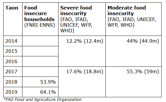 Ayon pa sa Food and Nutrition Research Institute (FNRI), anim o 64.1% sa bawat sampung pamilyang Pilipino ang walang kaseguruhan sa pagkain noon pa mang 2019. Mas tumaas pa ang tantos ng mga nagugutom mula sa naitalang 53.9% noong 2018.