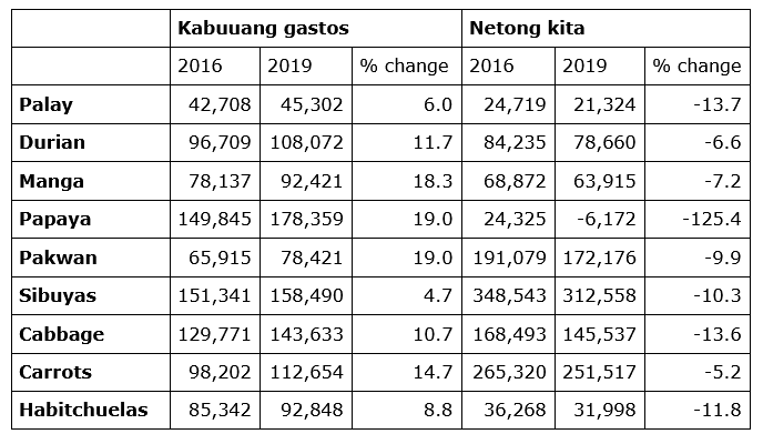 Ayon PSA, mula 2016 hanggang 2019 ay lumobo nang 13% ang gastos sa pagsasaka habang lumiit nang 24% ang kinikita ng mga magbubukid sa sumusunod na labing-dalawang (12) tanim. Katumbas ito ng average P16,283 dagdag na gastos at P26,020 kabawasan sa kita kada anihan para sa naturang mga tanim.