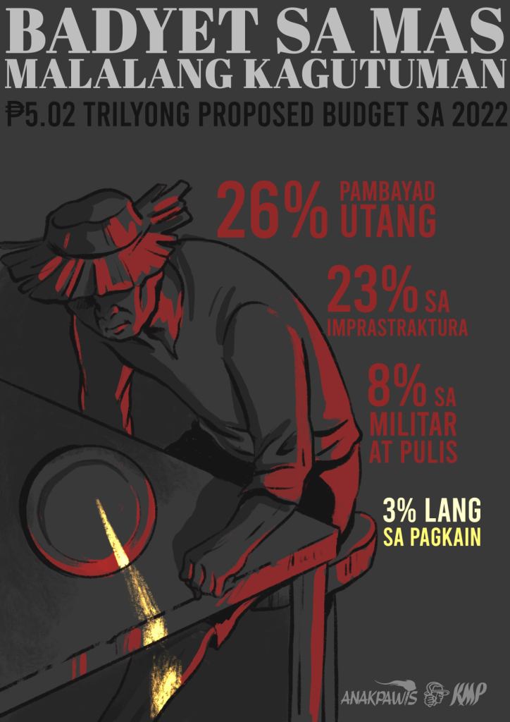 Sa bawat P100 pondong pampubliko, ₱26 ang nakalaan sa pambayad-utang, ₱23 para sa mga kalsada, ₱4 para sa mga baril at bomba, samantalang P3 lang para sa agrikultura at pagkain. Tiyak na ang pambansang badyet para sa 2022 ay magdudulot pa ng mas malalang kagutuman at pasismo.