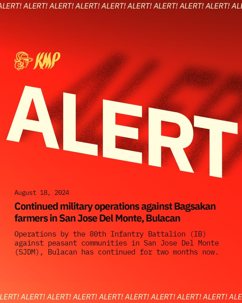 KMP condemns the 80th IB’s persistent militarization of peasant communities in SJDM. The soldiers have violated the Bagsakan farmers’ constitutionally-guaranteed human rights, putting their lives and safety in danger. They should immediately leave the farmers alone and let them resume their farming activities. KMP and its local chapters are legal and legitimate organizations promoting peasants’ rights. These include not only the right to speak, organize, assemble, and due process, but also the right to land, livelihood, and social services. We urge the local government of SJDM to more firmly stand with farmers and democracy, and refuse to be used in the military’s campaign of terror and human rights violations.