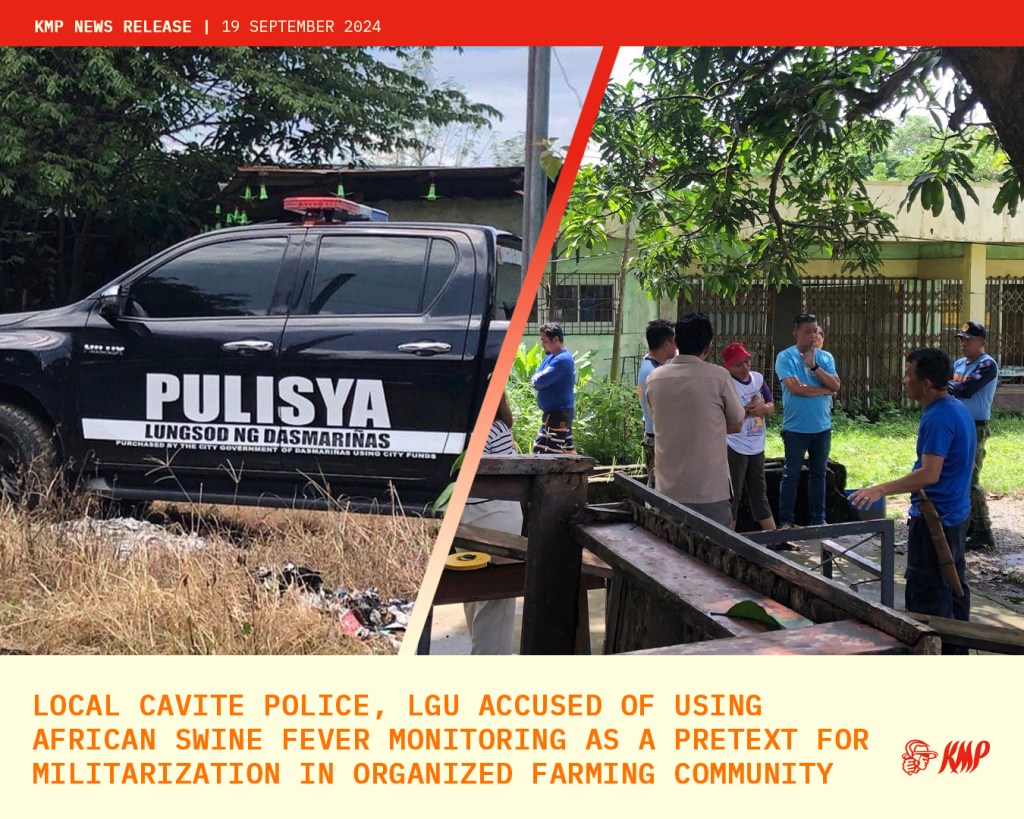 The Kilusang Magbubukid ng Pilipinas (KMP) has joined forces with the Katipunan ng mga Lehitimong Magsasaka at Mamamayan sa Lupang Ramos (KASAMA LR) in Dasmariñas City, Cavite, to raise concerns over the increased military and police presence in their community under the guise of monitoring and containing African Swine Fever (ASF).