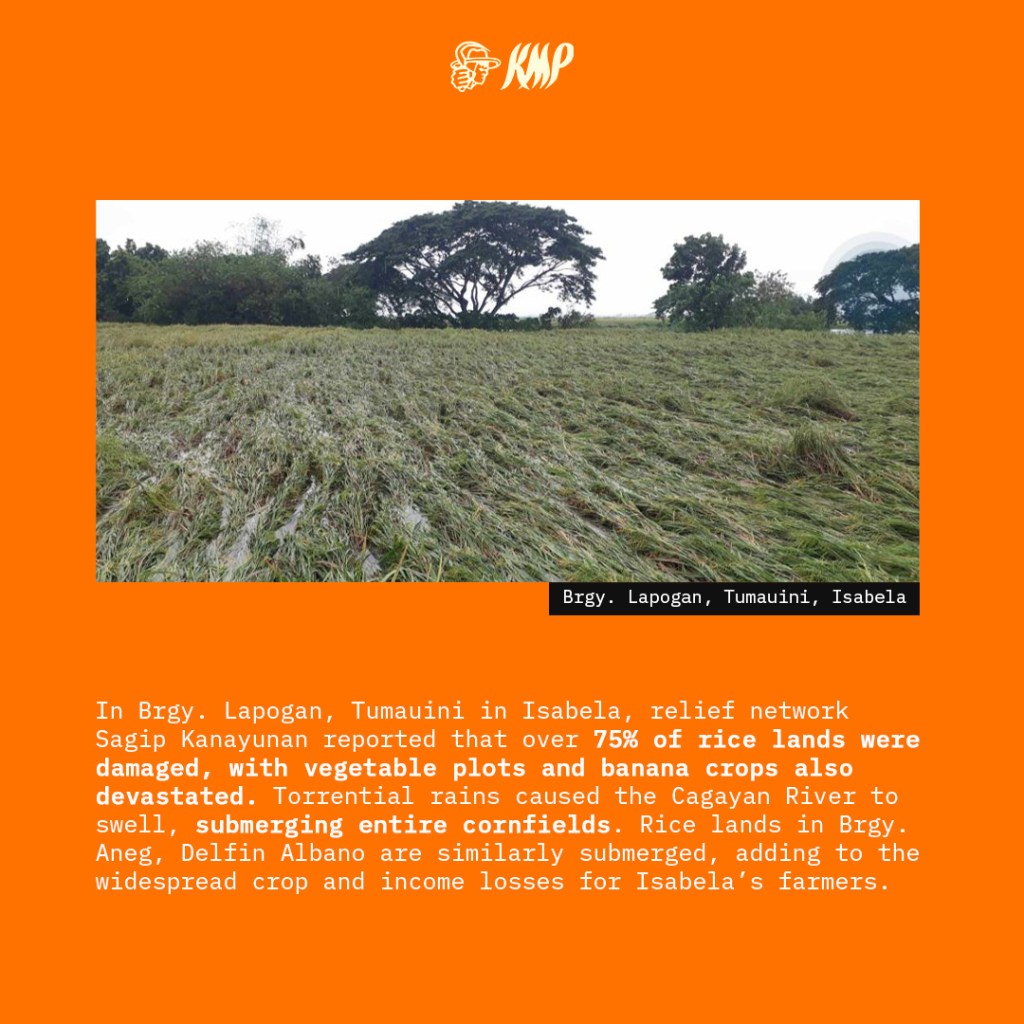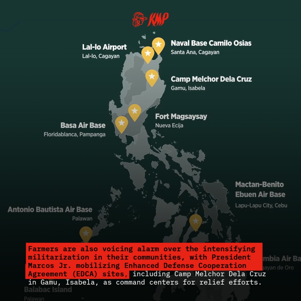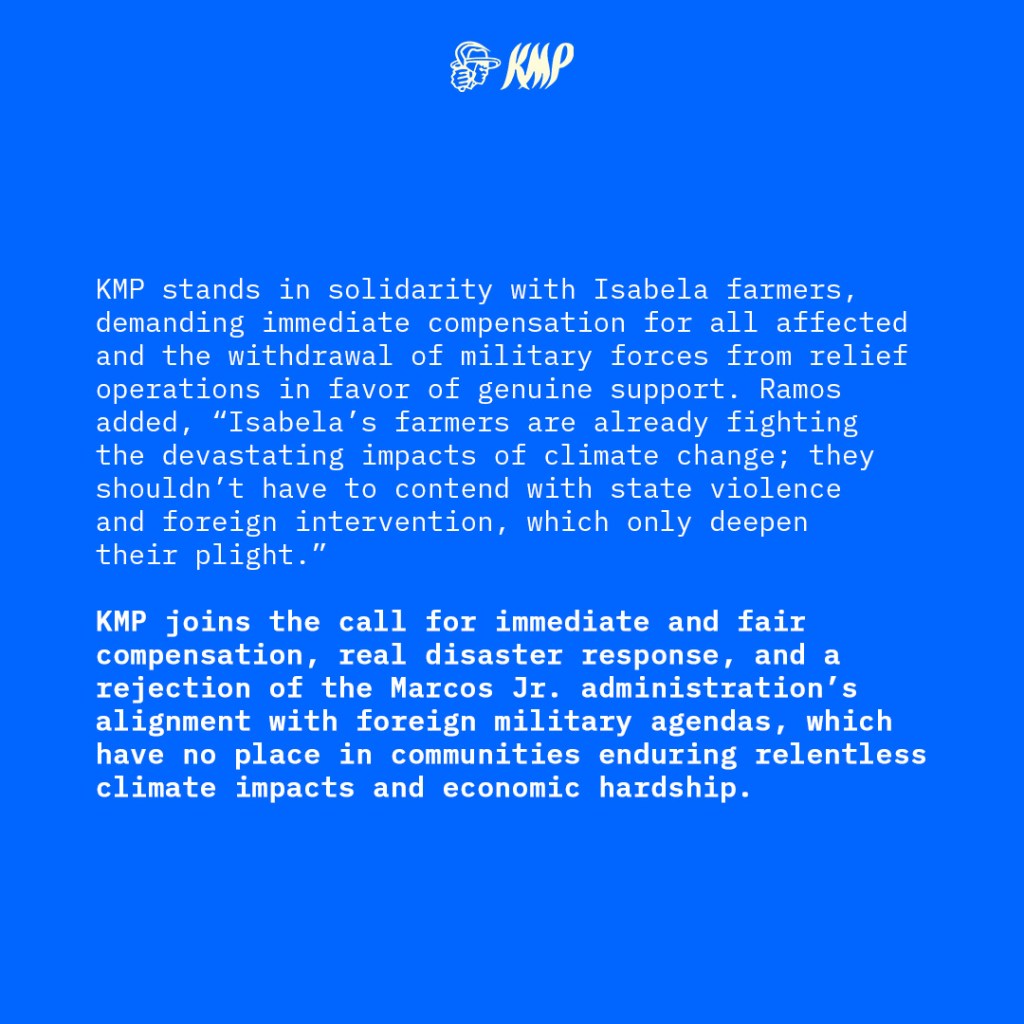 KMP stands in solidarity with Isabela farmers, demanding immediate compensation for all affected and the withdrawal of military forces from relief operations in favor of genuine support. Ramos added, “Isabela’s farmers are already fighting the devastating impacts of climate change; they shouldn’t have to contend with state violence and foreign intervention, which only deepen their plight.”