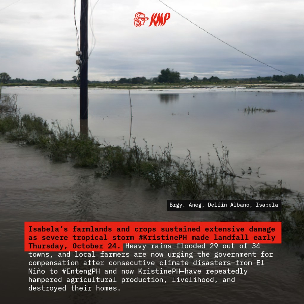 Isabela’s farmlands and crops sustained extensive damage as severe tropical storm #KristinePH made landfall early Thursday, October 24. Heavy rains flooded 29 out of 34 towns, and local farmers are now urging the government for compensation after consecutive climate disasters—from El Niño to #EntengPH and now Kristine—have repeatedly hampered agricultural production, livelihood, and destroyed their homes. Farmers are also voicing alarm over the intensifying militarization in their communities, with President Marcos Jr. mobilizing Enhanced Defense Cooperation Agreement (EDCA) sites, including Camp Melchor Dela Cruz in Gamu, Isabela, as command centers for relief efforts.