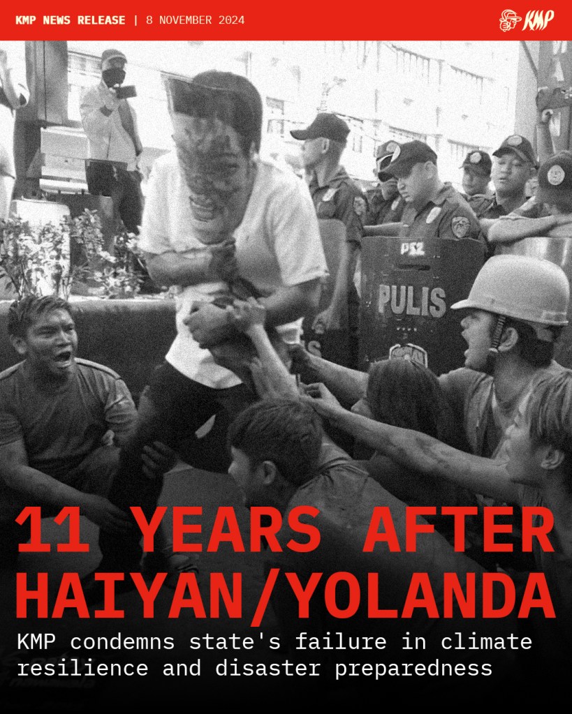 On the 11th year commemoration of super typhoon Haiyan (Yolanda), the Kilusang Magbubukid ng Pilipinas (KMP) and multisectoral groups protested near Mendiola in Manila this morning to denounce the PH government’s accountability in worsening the climate crisis and its failure in climate resilience and disaster preparedness. Regarded as the worst typhoon to hit the Philippines, the category 5 Haiyan killed more than 6,000 in Tacloban City and Leyte and left millions homeless due to massive storm surges.