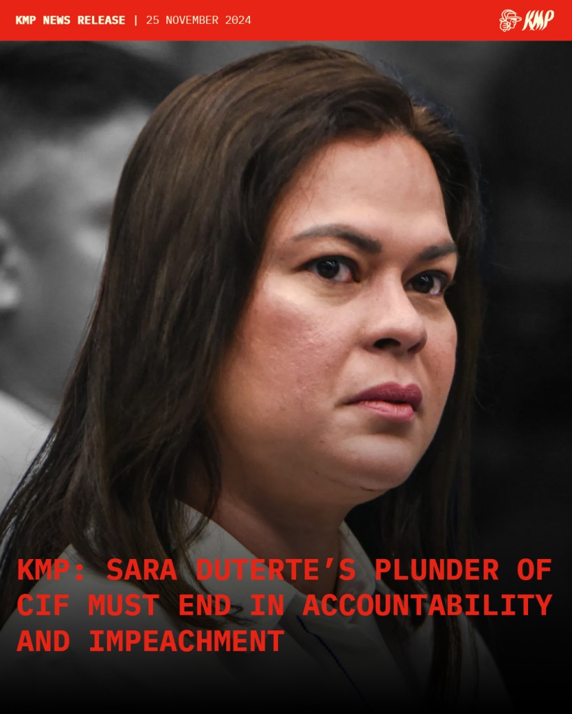 Farmers group Kilusang Magbubukid ng Pilipinas (KMP) joins the growing public clamor demanding the accountability of Vice President Sara Duterte for the blatant misuse of hundreds of millions in Confidential and Intelligence Funds (CIF). We call for immediate impeachment proceedings against her for corruption and betrayal of public trust.