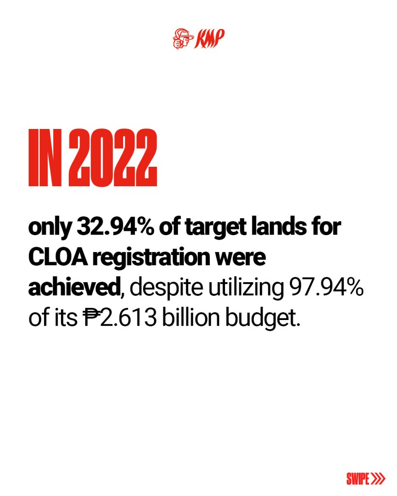 KMP also slammed DAR’ inability to meet land acquisition and distribution (LAD) targets. In 2022, only 32.94% of target lands for CLOA registration were achieved, despite utilizing 97.94% of its ₱2.613 billion budget. Many lands under collective CLOAs remain undistributed for decades, depriving aging farmers of rightful ownership and perpetuating inequality.