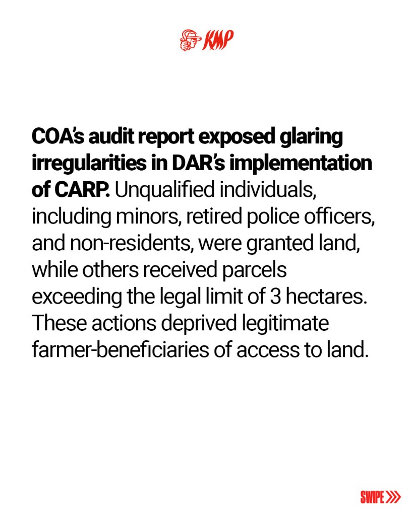The Kilusang Magbubukid ng Pilipinas (KMP) vehemently condemns the Department of Agrarian Reform (DAR) under Marcos Jr. for perpetuating landlessness and agrarian injustices, as revealed by recent Commission on Audit (COA) findings of ineligible beneficiaries and over-distribution of lands under the Comprehensive Agrarian Reform Program (CARP).