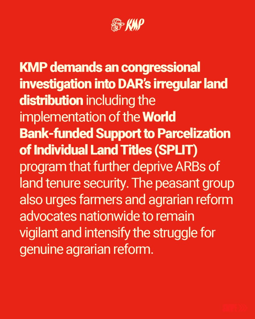 KMP demands an congressional investigation into DAR’s irregular land distribution including the implementation of the World Bank-funded Support to Parcelization of Individual Land Titles (SPLIT) program that further deprive ARBs of land tenure security. The peasant group also urges farmers and agrarian reform advocates nationwide to remain vigilant and intensify the struggle for genuine agrarian reform. #