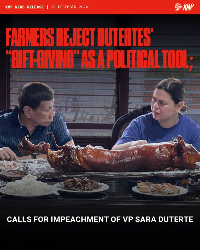 The annual yuletide “Pahalipay sa Taal” event hosted by the Duterte family is yet another glaring example of political patronage disguised as charity, according to the Kilusang Magbubukid ng Pilipinas. “While Vice President Sara Duterte and her father, former President Rodrigo Roa Duterte, take pride in this spectacle, it remains a testament to their blatant use of public office for personal gain and influence. The Dutertes cannot cover-up with dole-outs the growing demand for accountability regarding VP Sara’s confidential funds and abuse of political power,” says Danilo Ramos, chairperson of KMP.