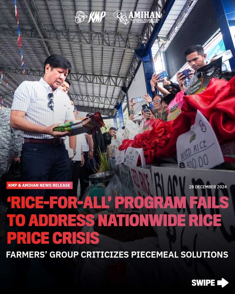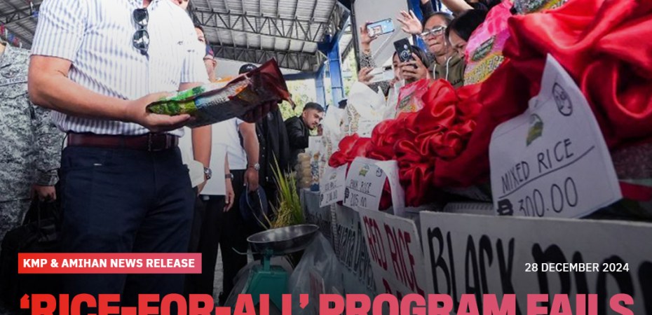 The Kilusang Magbubukid ng Pilipinas (KMP) and Amihan National Federation of Peasant Women (AMIHAN) today criticized anew the Department of Agriculture’s (DA) much-touted “Rice-for-All” program, calling it a stopgap measure that fails to address the roots of chronic high rice prices and the worsening plight of farmers and consumers nationwide.