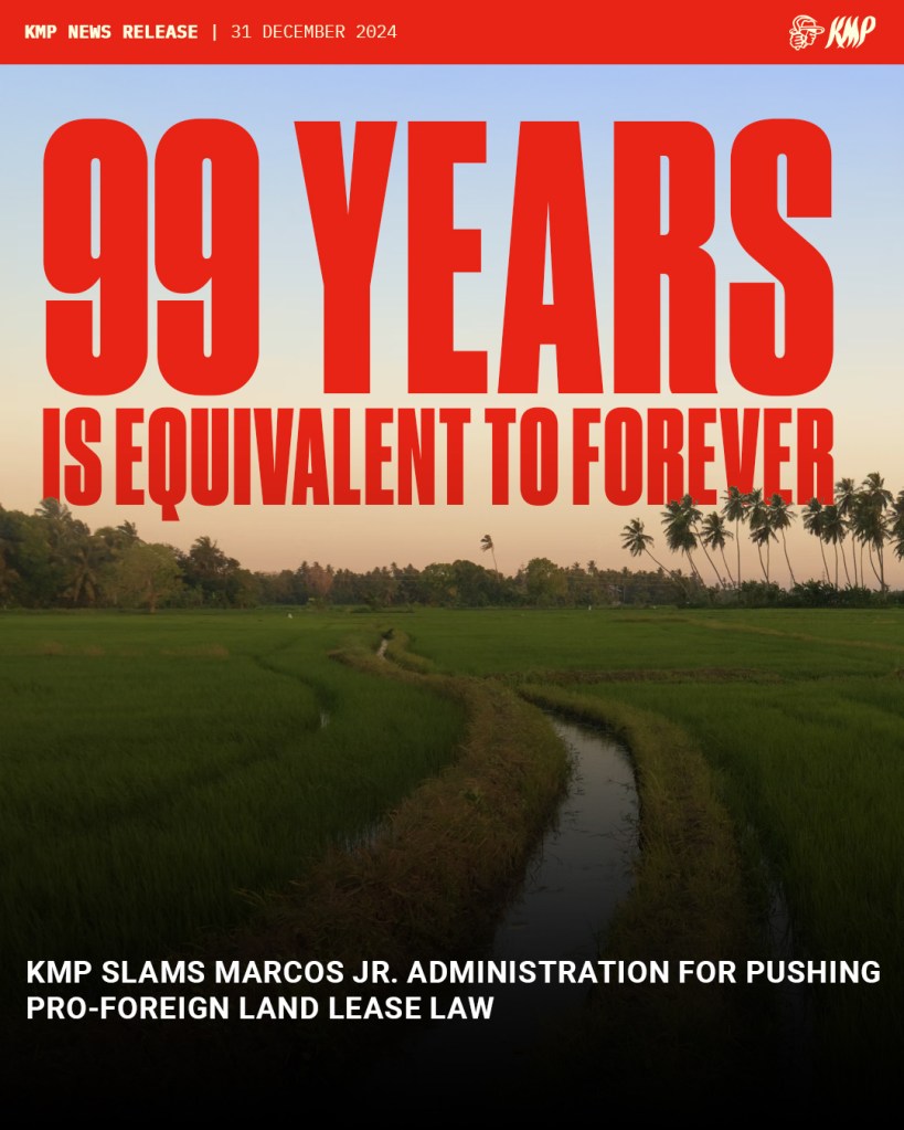 Danilo Ramos, KMP chairperson, lambasted the measure, stating, “A 99-year lease is virtually equivalent to perpetual foreign control over our lands. These bills sell out our nation’s patrimony to foreign interests at the expense of Filipino farmers and rural communities. “Allowing foreign investors to lease land for almost a century jeopardizes national sovereignty, food security, and the rights of farmers. It institutionalizes policies that perpetuate land monopoly and rural poverty. It is a stark reminder that Marcos Jr. serves as the chief representative of landlords and foreign corporations, not the Filipino people.”